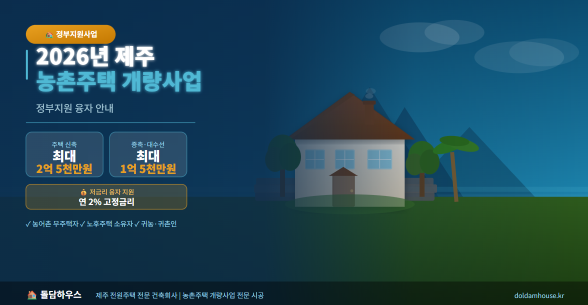 핵심 요약: 제주 농어촌 지역 주민 및 귀농·귀촌인이 주택을 신축하거나 개량할 때, 연 2% 고정금리로 최대 2억 5천만 원까지 저렴하게 빌릴 수 있는 사업입니다.